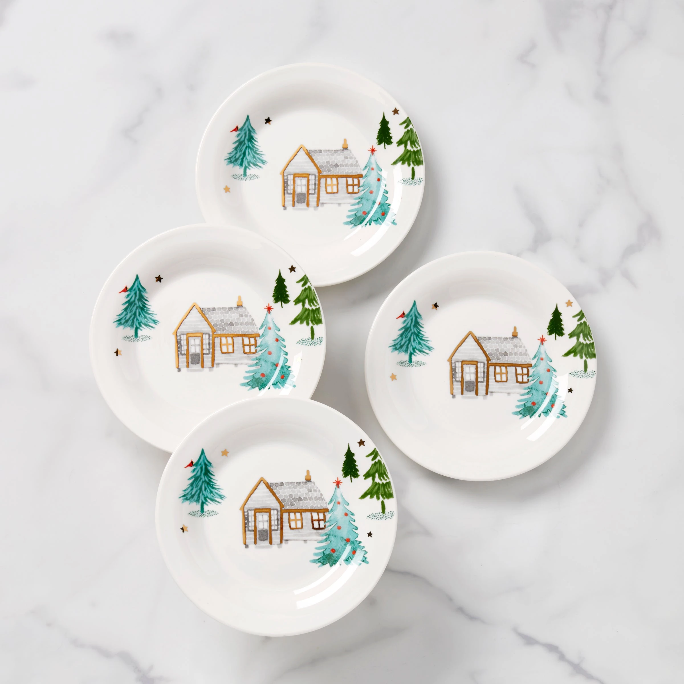 This 4-piece tidbit plate set comes from our beloved Balsam Lane collection that features a winter scene of lush trees, artistic cabins and golden stars.
