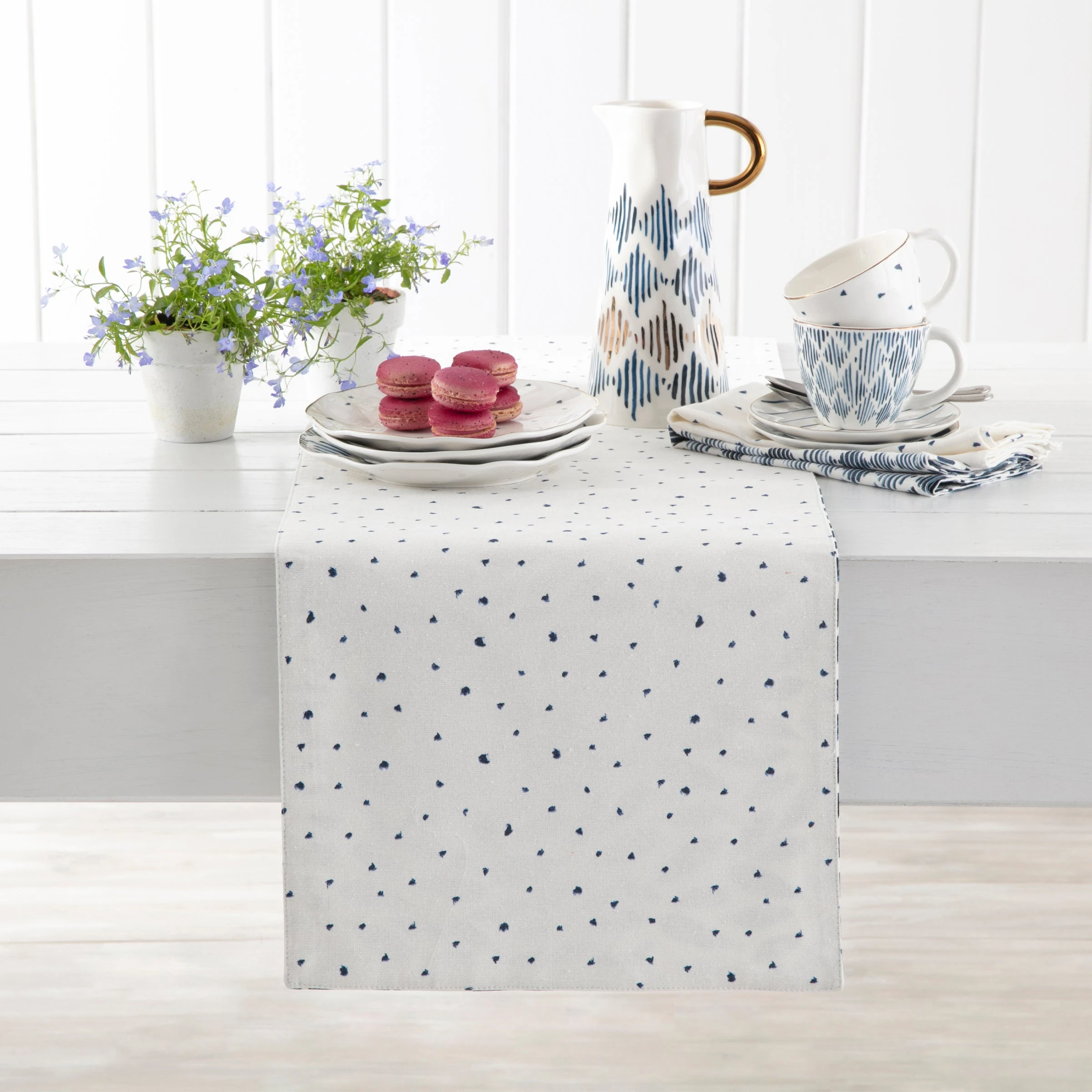 This sweet and simple table runner features Blue Bay’s textile-inspired patterns and organic shapes. Choose which side you show: timeless natural leaf motifs or an elegantly understated dot-heavy design.