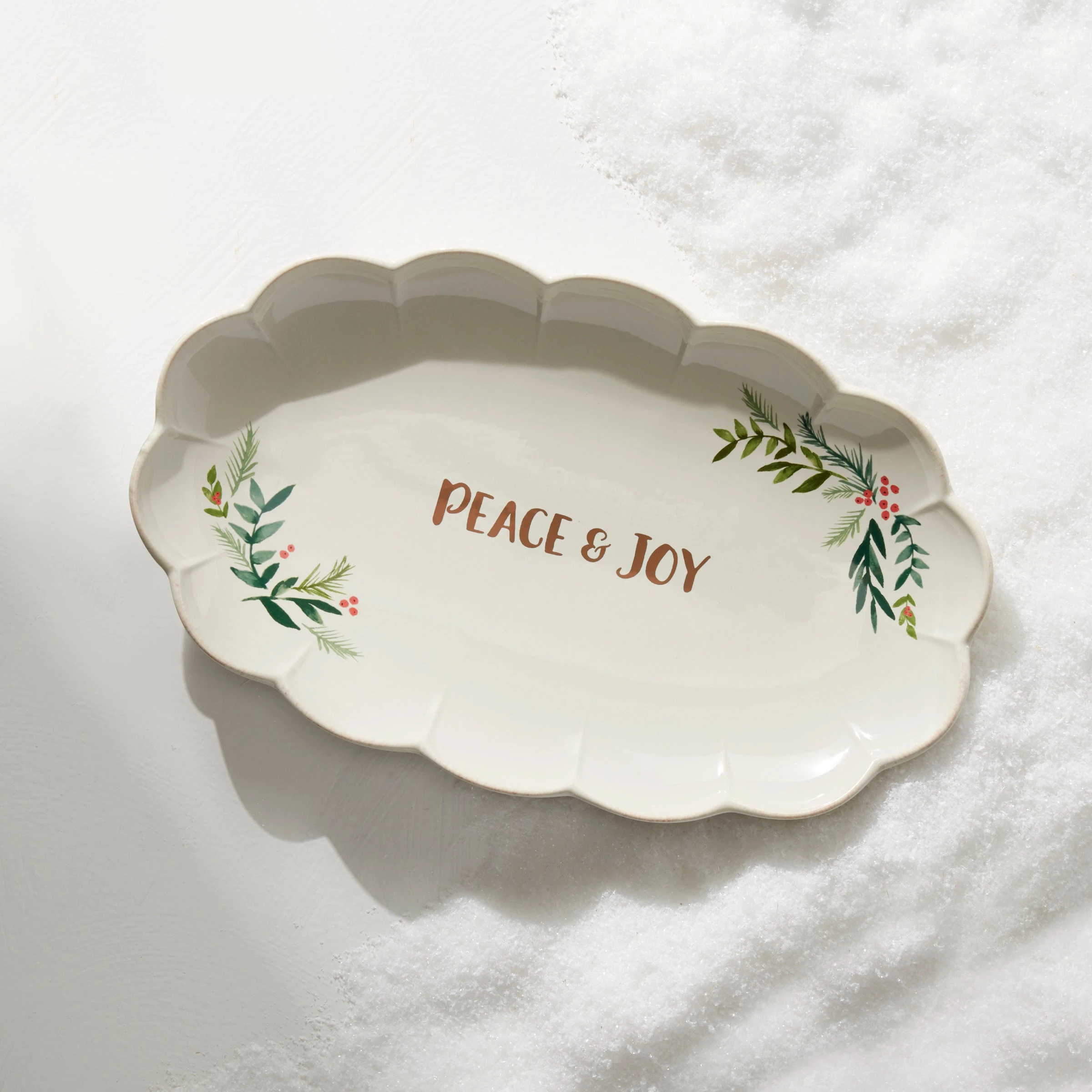 A festive fresh spin on the French Perle favorites. This platter features a wreath of artistic holiday holly with leaves, branches, and berries in a handpainted style around the words “Peace & Joy”. Crafted with smooth scallops on a snowy white base for a creative winter feel.