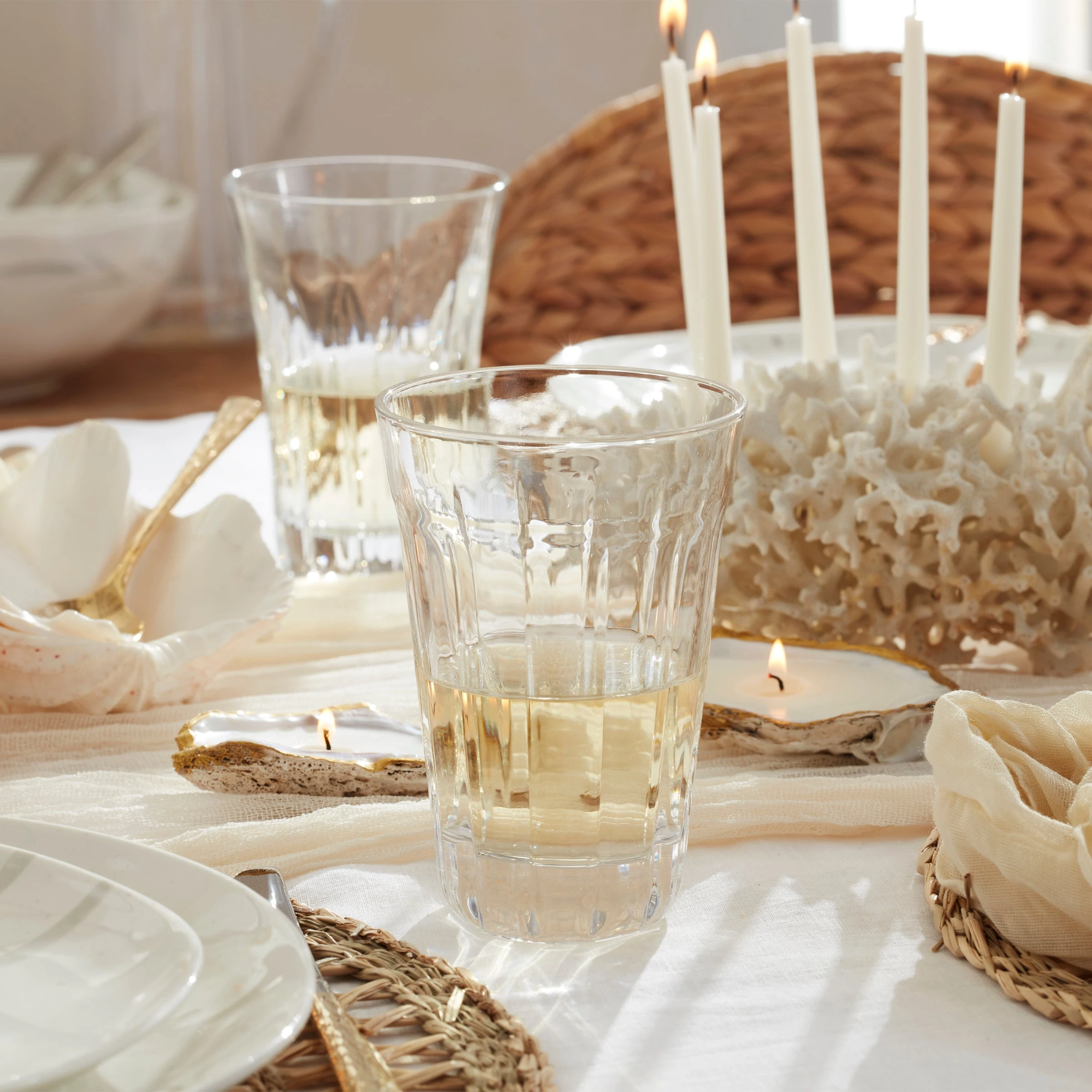 Made to complement any collection of French Perle, these grooved glasses are mouth-blown for a crafted, artisanal aesthetic that’s at home in a lovingly lived-in kitchen.