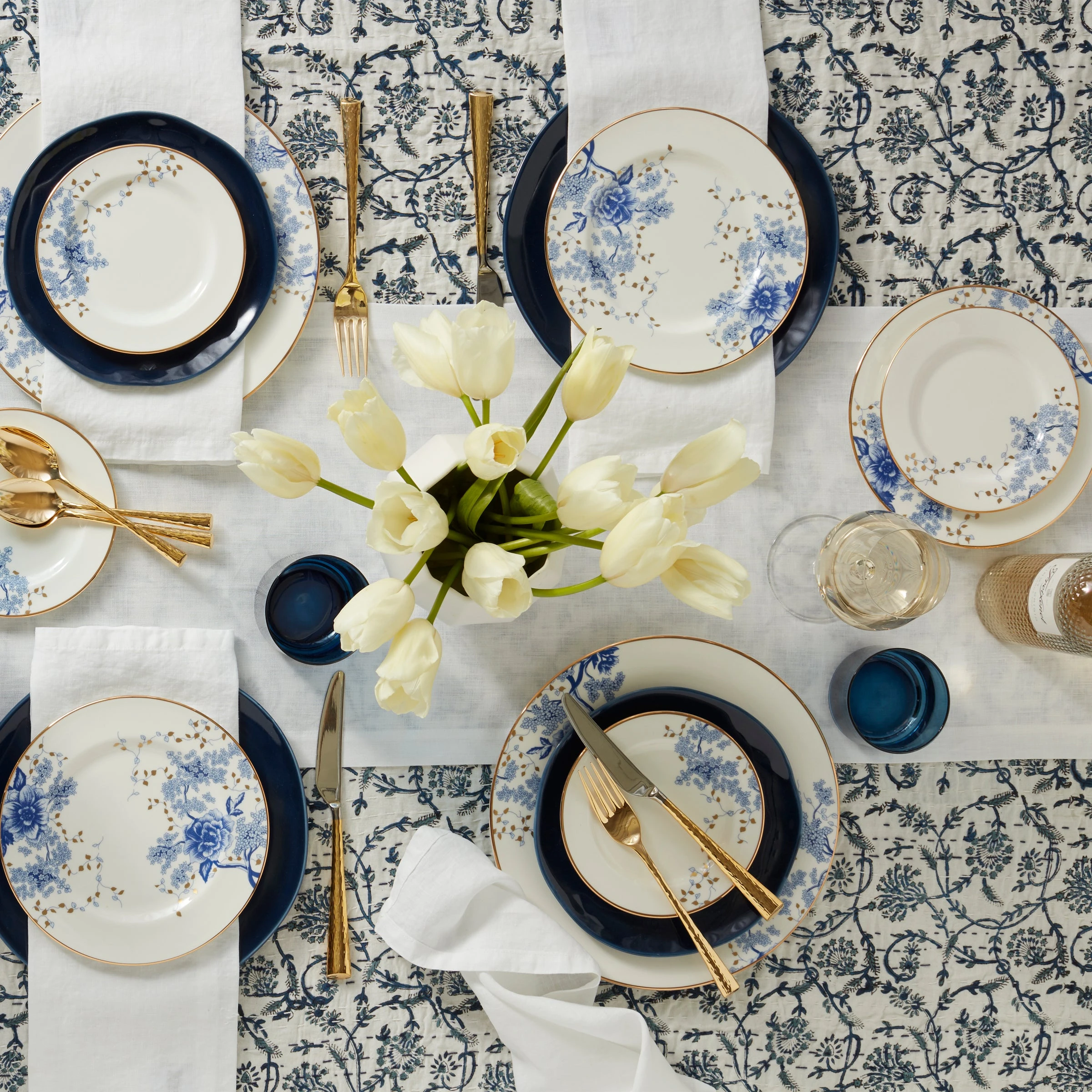 The Garden Grove Saucer adds poise and texture to an elegant tea time tablescape. A traditional blue blossom pattern is set over durable white bone china, with delicate gold botanical accents and a 24-karat gold trim. Saucer is dishwasher-safe.