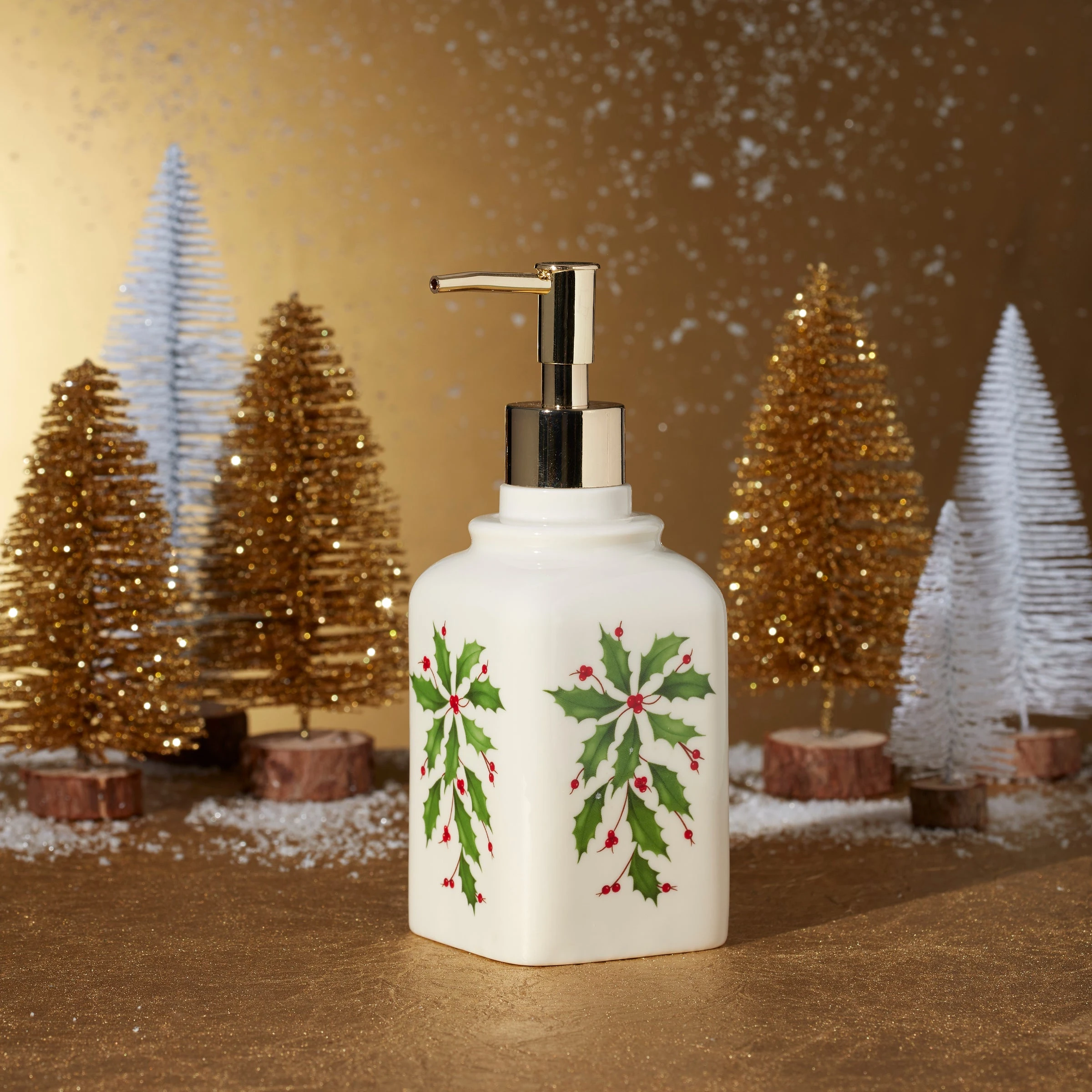 Celebrate the season with our most popular seasonal pattern, first introduced in 1974! This festive soap/lotion dispenser is detailed with our iconic holly and berry motif to bring extra cheer to your home this Christmas. For a touch of glam, gleaming gold accents shine with seasonal spirit.