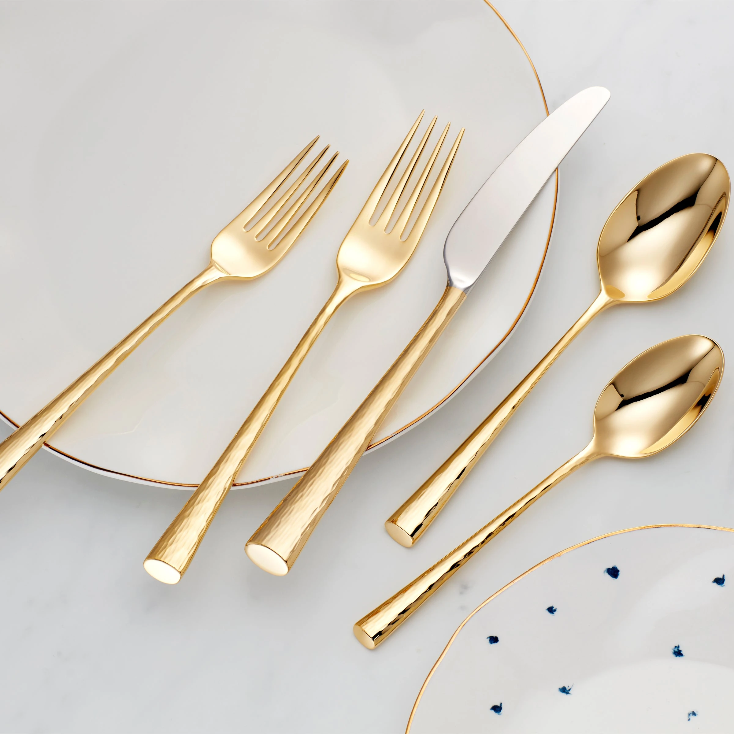 This elegant and intriguing Imperial Caviar flatware setting features a subtle hammered texture that will impress and enthrall guests. This glowing golden place setting includes a salad fork, dinner fork, soup spoon, dessert spoon, and butter knife.