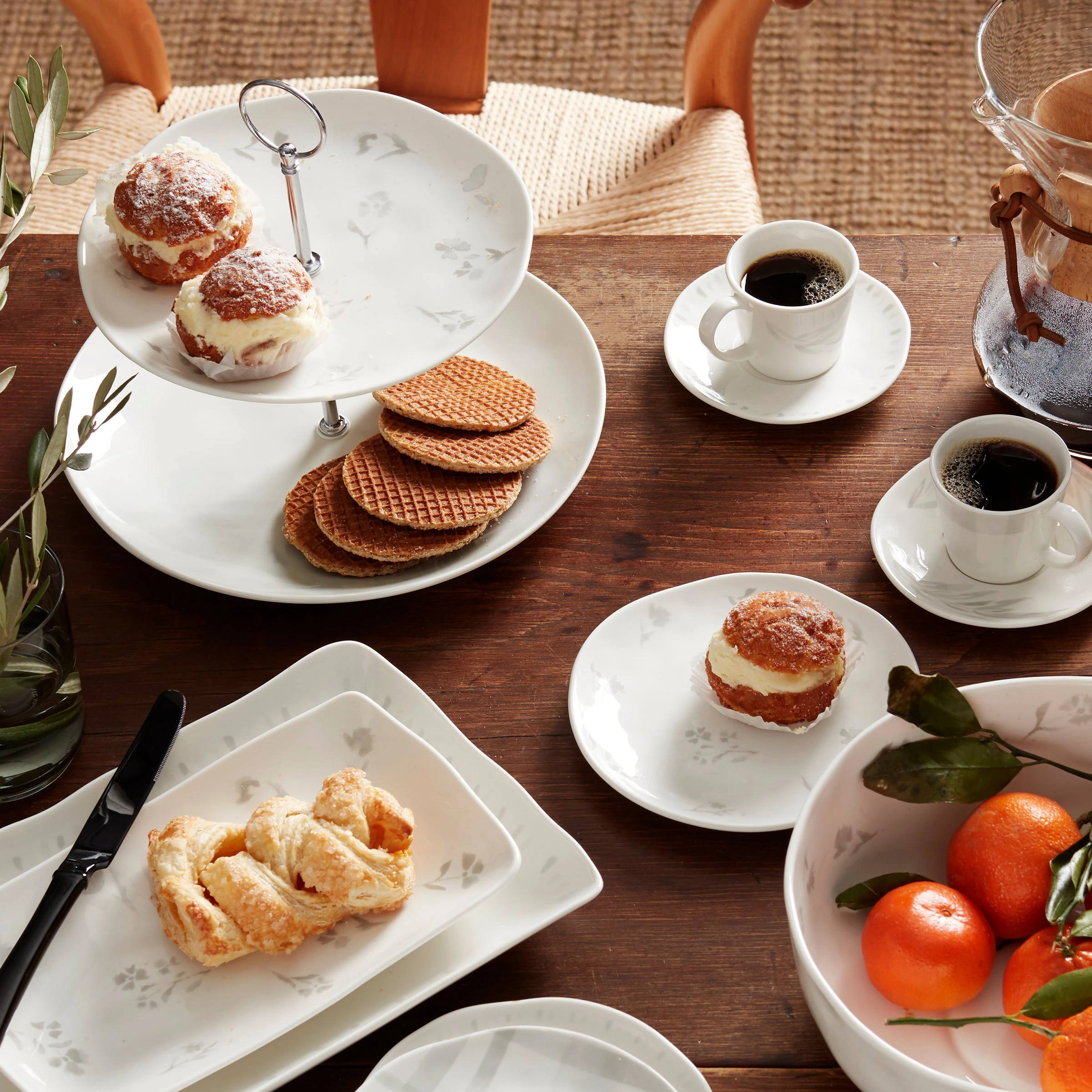 Simplicity meets style with this addition to the Oyster Bay collection, a sister pattern to best-selling Blue Bay. The two-tiered server lends a calming appeal to your kitchen with its organic shape and natural, watercolor-inspired art. A subtle speckle backdrop gives the impression of texture on durable porcelain.