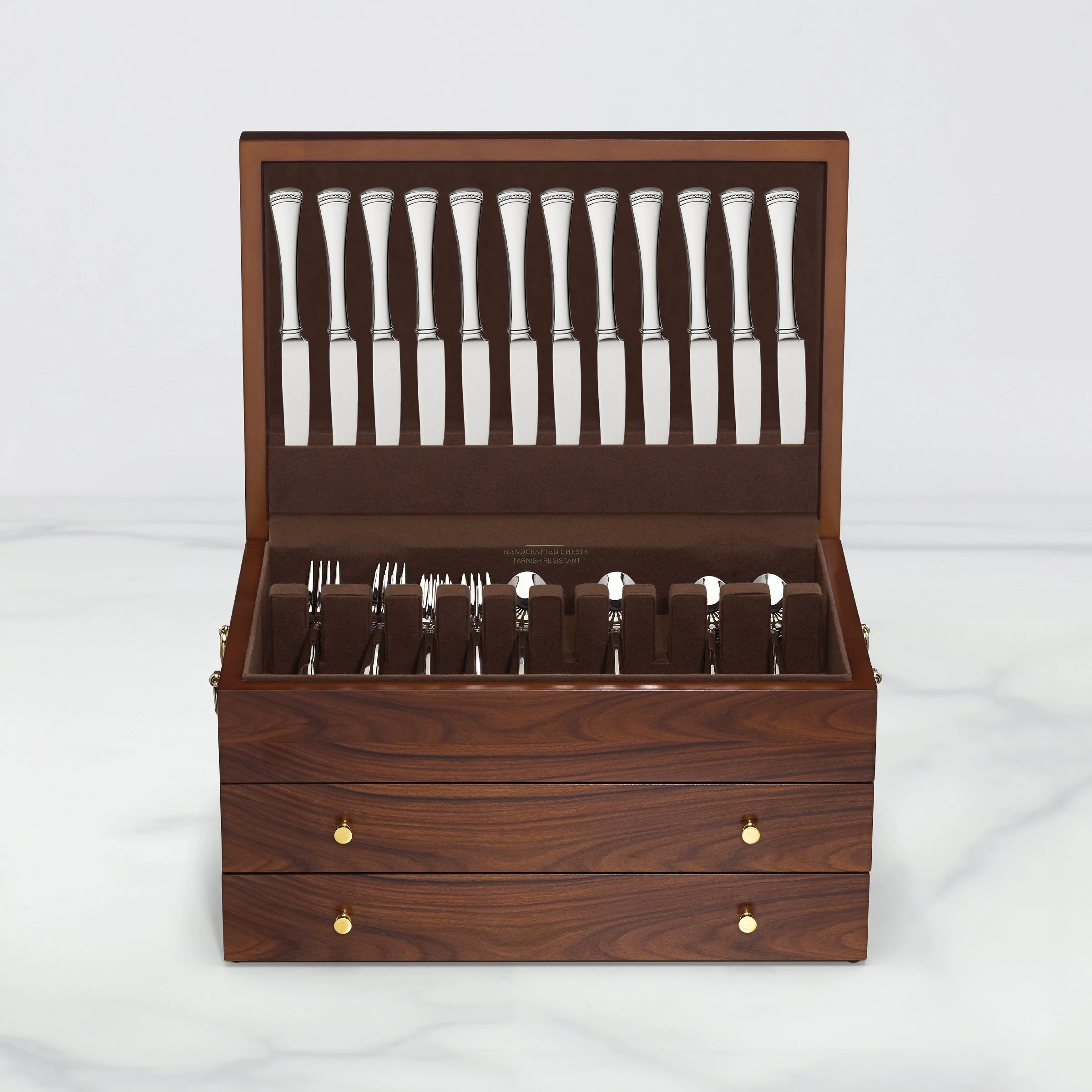 Make room for your large flatware sets by storing it into this handsome flatware chest crafted of rosewood. Lift the lid at the tiny gold handle to unveil two sections: a top section to tuck in steak knives and a bottom section that separates out spoons, forks and more. There are two additional drawers below for storage serving pieces. The entire flatware chest holds an entire service for 24 people, plus serving pieces! It’s the perfect gift for anyone who needs to make more space in their dining room (and do so in style!)