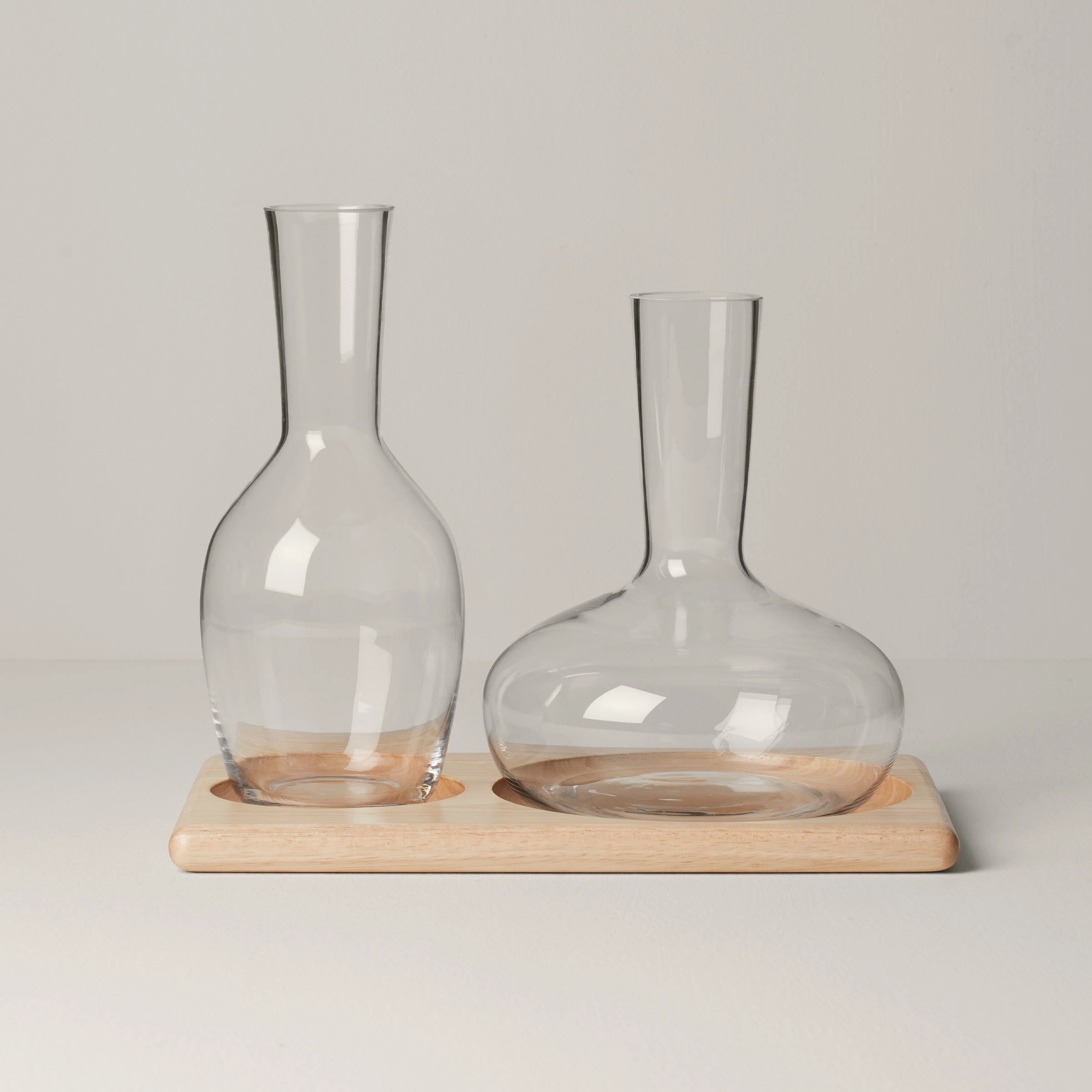 Bring an innovative, elegant look to every event with the perfect set for aerating and elevating all your refreshments. This Tuscany Classics carafe set features a wide and tall carafe hosted atop a stylish wooden tray. Both carafes are crafted of durable, pristine glass and dishwasher-safe for added convenience.