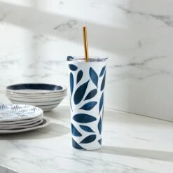 Lenox Blue Bay Leaf Stainless Steel Tumbler With Straw